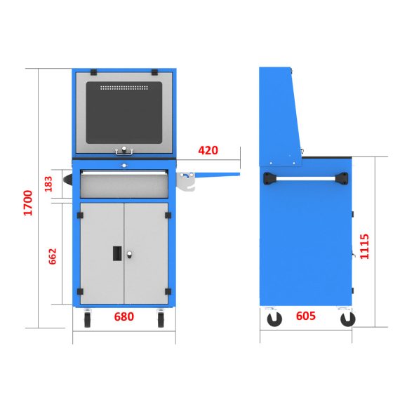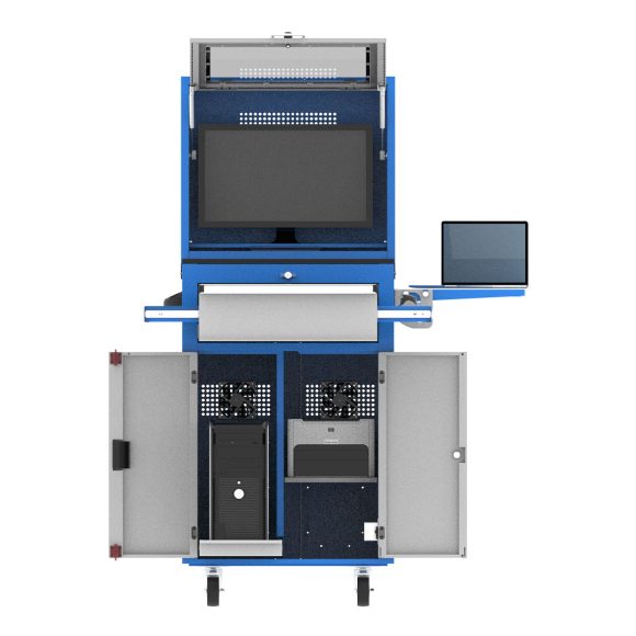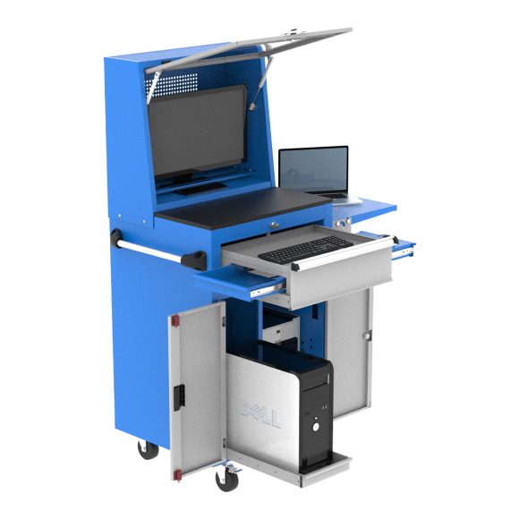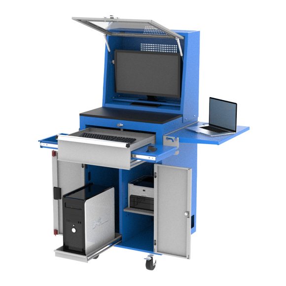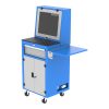 Movable Computer Desk with lockable wheels and segregated compartments, featuring an electrostatic paint coating, suitable for use in various industrial environments.
