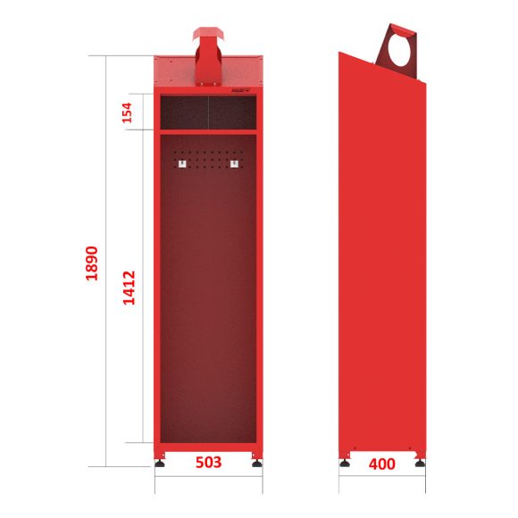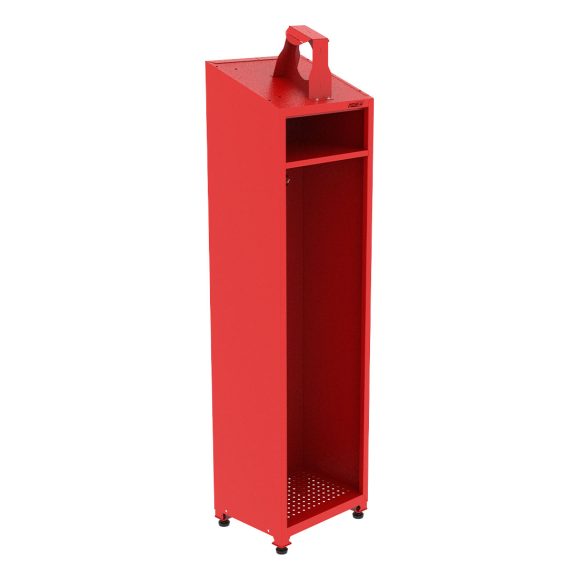 Clothing cabinet suitable for use in fire stations, with electrostatic paint coating, separated compartments, and appropriate sheet thickness.