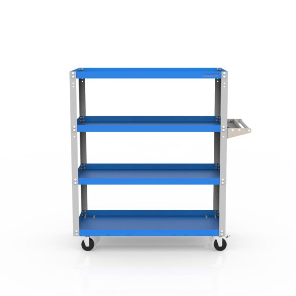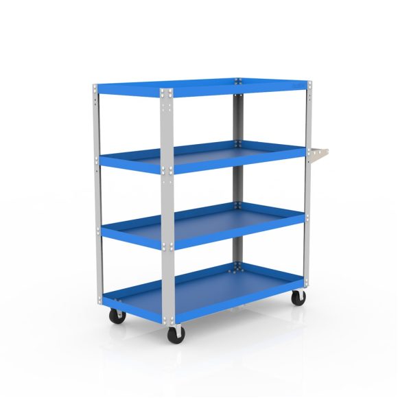 Heavy-duty trolley for transporting bulky parts in various industrial and commercial environments, featuring an electrostatic paint coating and lockable wheels.