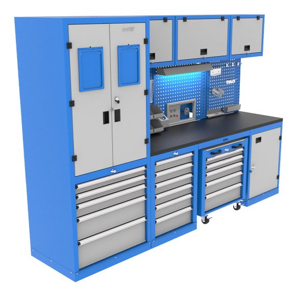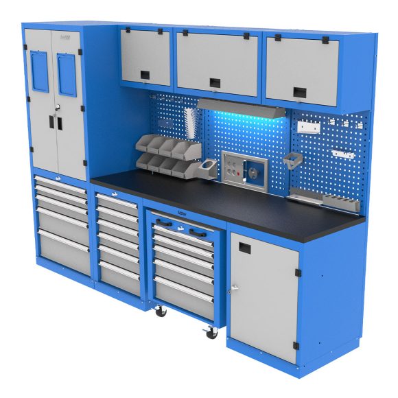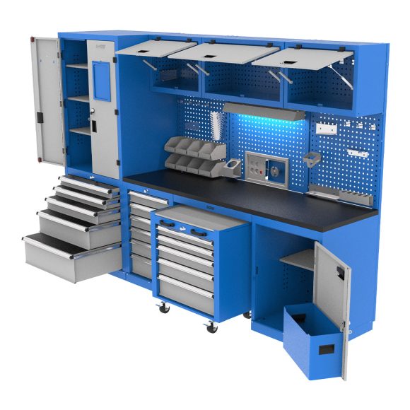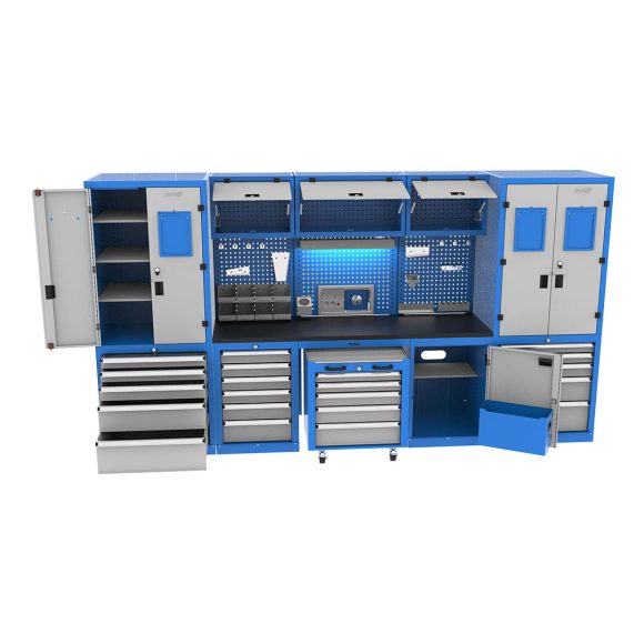 Industrial cabinet featuring a workshop toolbox, wardrobe, and tool display board, combining various products. It has an electrostatic paint coating and is suitable for use in various industrial environments.
