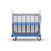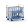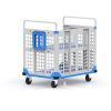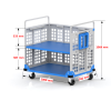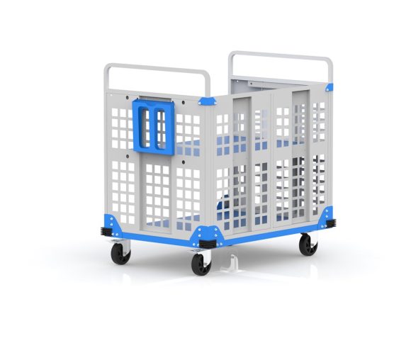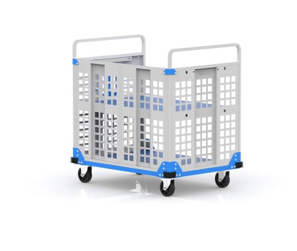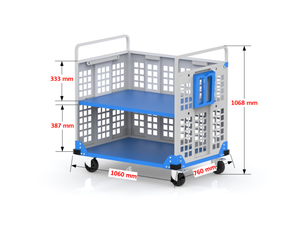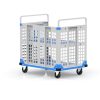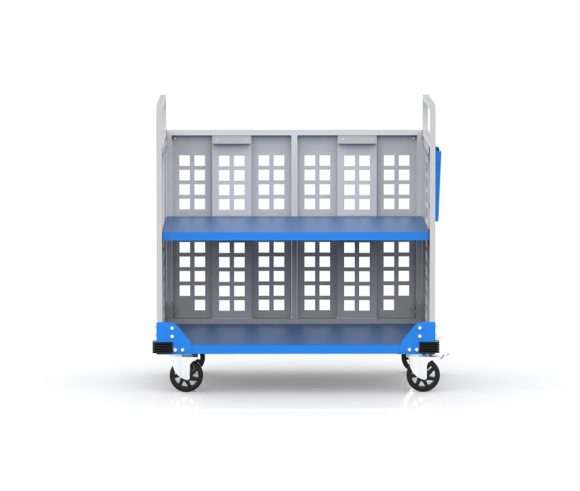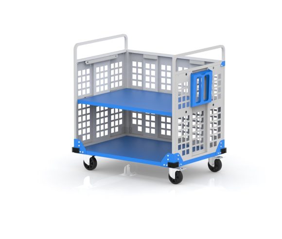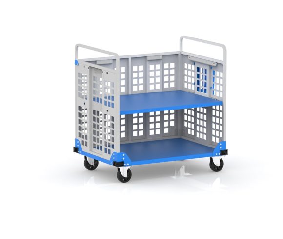 Heavy-duty trolley for transporting bulky parts in various industrial and commercial environments, featuring an electrostatic paint coating and lockable wheels.