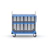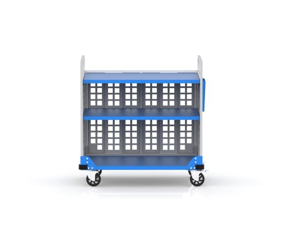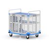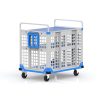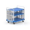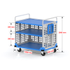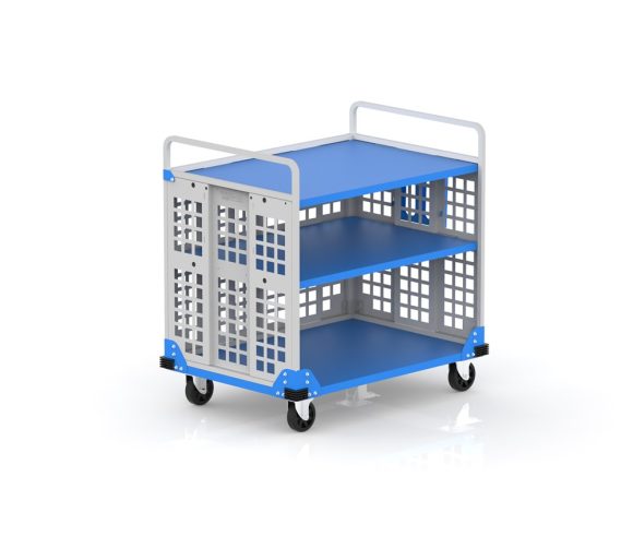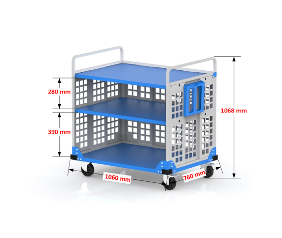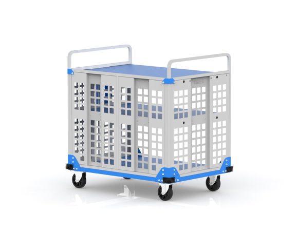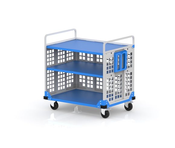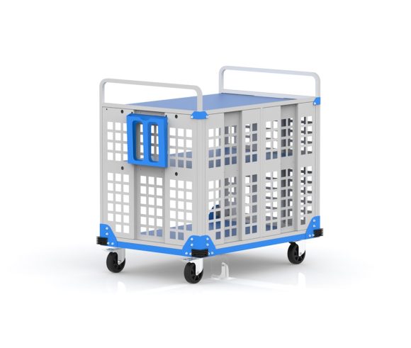 Heavy-duty trolley for transporting bulky parts in various industrial and commercial environments, featuring an electrostatic paint coating and lockable wheels.