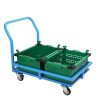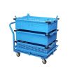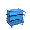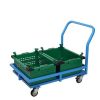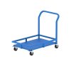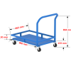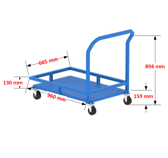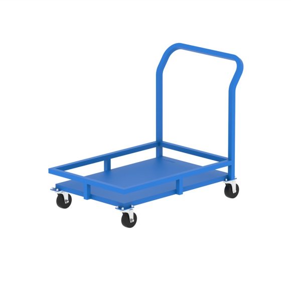 Heavy-duty trolley for transporting bulky parts in various industrial and commercial environments, featuring an electrostatic paint coating and lockable wheels.