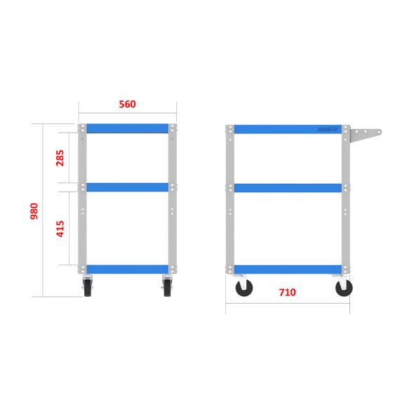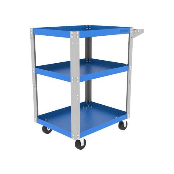 Heavy-duty trolley for transporting bulky parts in various industrial and commercial environments, featuring an electrostatic paint coating and lockable wheels.