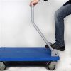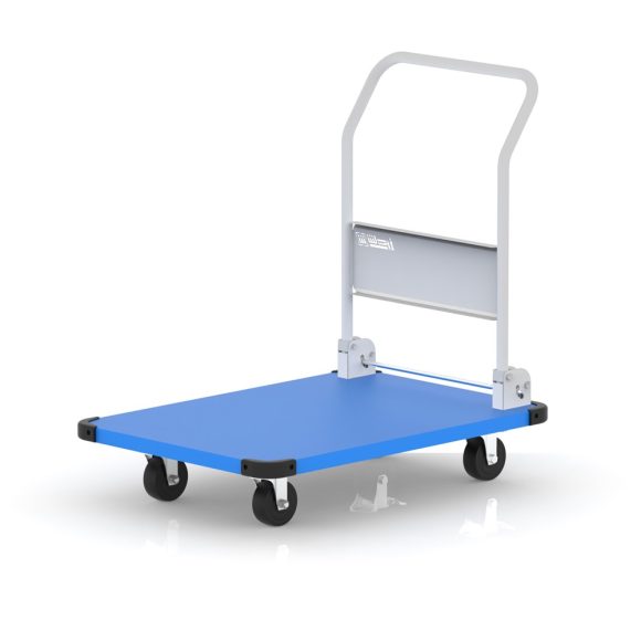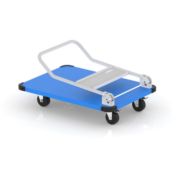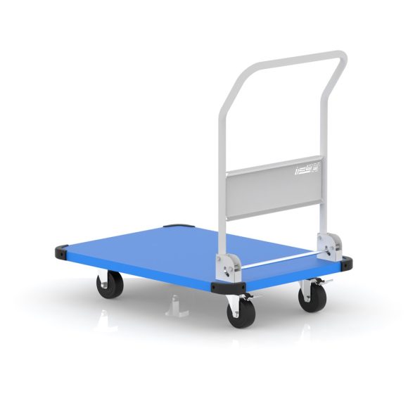 Heavy-duty trolley for transporting bulky parts in various industrial and commercial environments, featuring an electrostatic paint coating and lockable wheels.