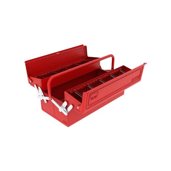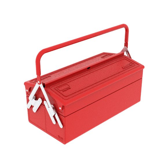 Metal tool box for protecting and transporting tools, featuring an electrostatic coating and suitable sheet thickness.