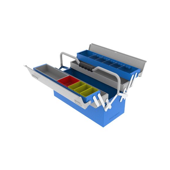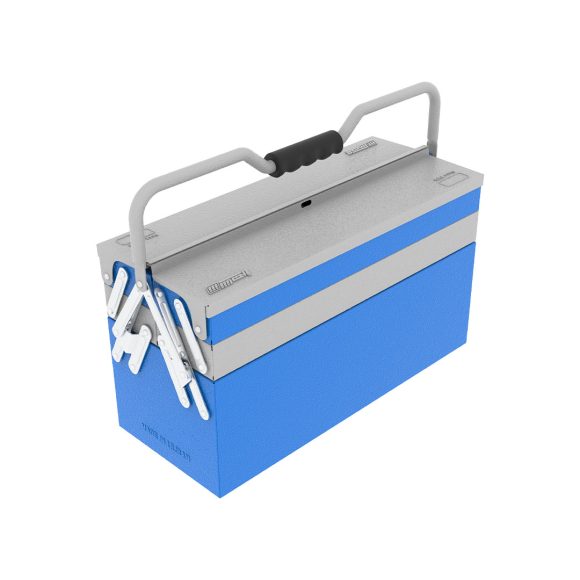Metal tool box for protecting and transporting tools, featuring an electrostatic coating and suitable sheet thickness.