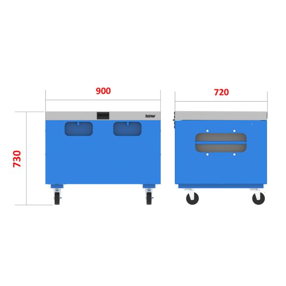 Heavy-duty toolboxes for transporting precision, electrical, and hand tools for various land, air, and sea transit, equipped with lockable wheels and two removable pallet trays, featuring an electrostatic paint coating.