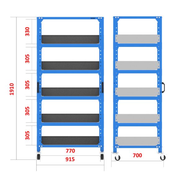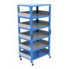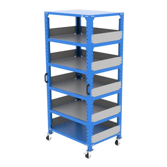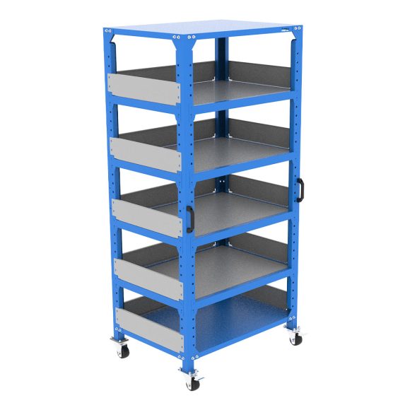 Storage equipment with wheels for lightweight parts, featuring multiple levels with adjustable shelves, along with walls to protect parts during transportation.