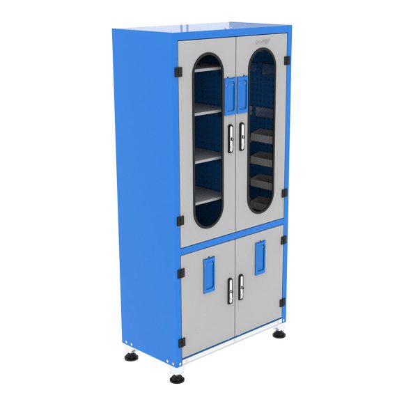Tool protection cabinet for safeguarding and storing tools and industrial parts, with electrostatic paint coating, separated compartments, appropriate sheet thickness, suitable for use in various industrial environments.