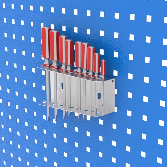 Holder clamps for protecting and displaying tools and parts, with the ability to attach to any Shahrakh product that has a mesh body. These clamps are equipped with an electrostatic paint coating, galvanized plating, or chrome plating for enhanced durability and resistance to corrosion.