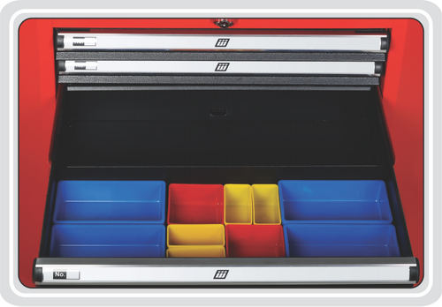 Sliding Steel Partitions: The top drawer in manufacturing toolboxes are organized with this system. Drawer divides to separated spaces using steel sheets sliding on a rail. These sheets could move or be removed in order to create suitable spaces for tools and instruments.