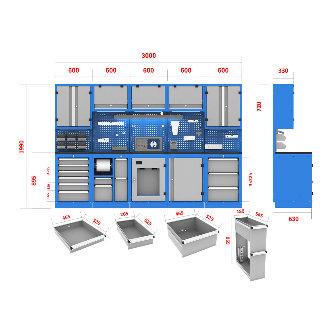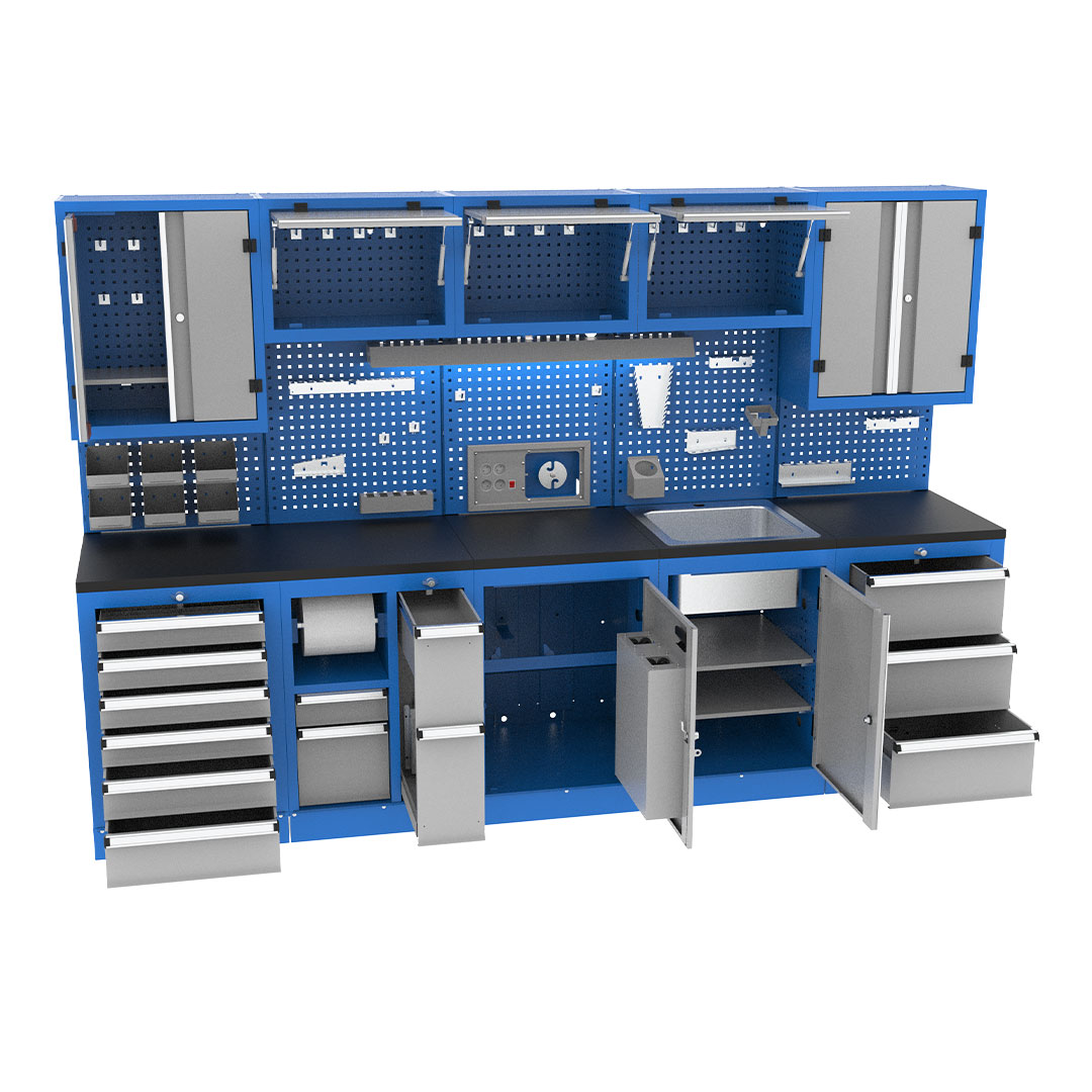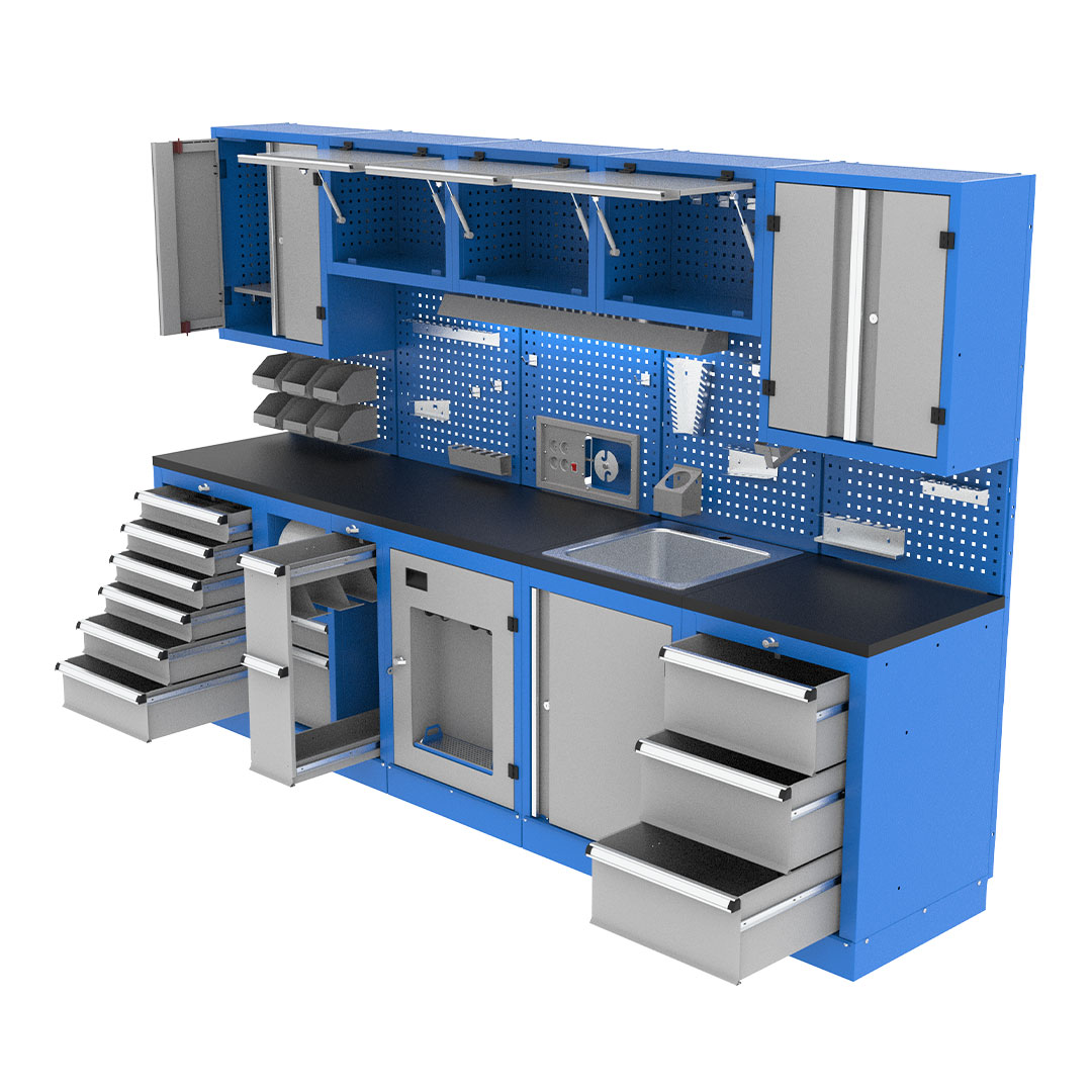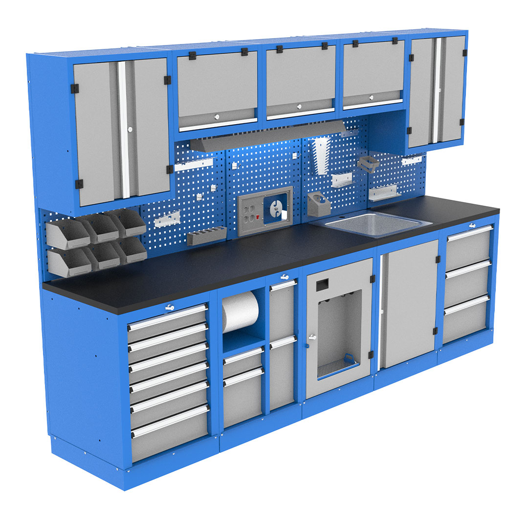 کابینت صنعتی دارای جعبه ابار کارگاهی، کمد و تابلو نمایش ابزار است که ترکیبی از محصولات مختلف میباشد. دارای پوشش رنگ الکترو استاتیک، قابل استفاده در انواع محیط های صنعتی